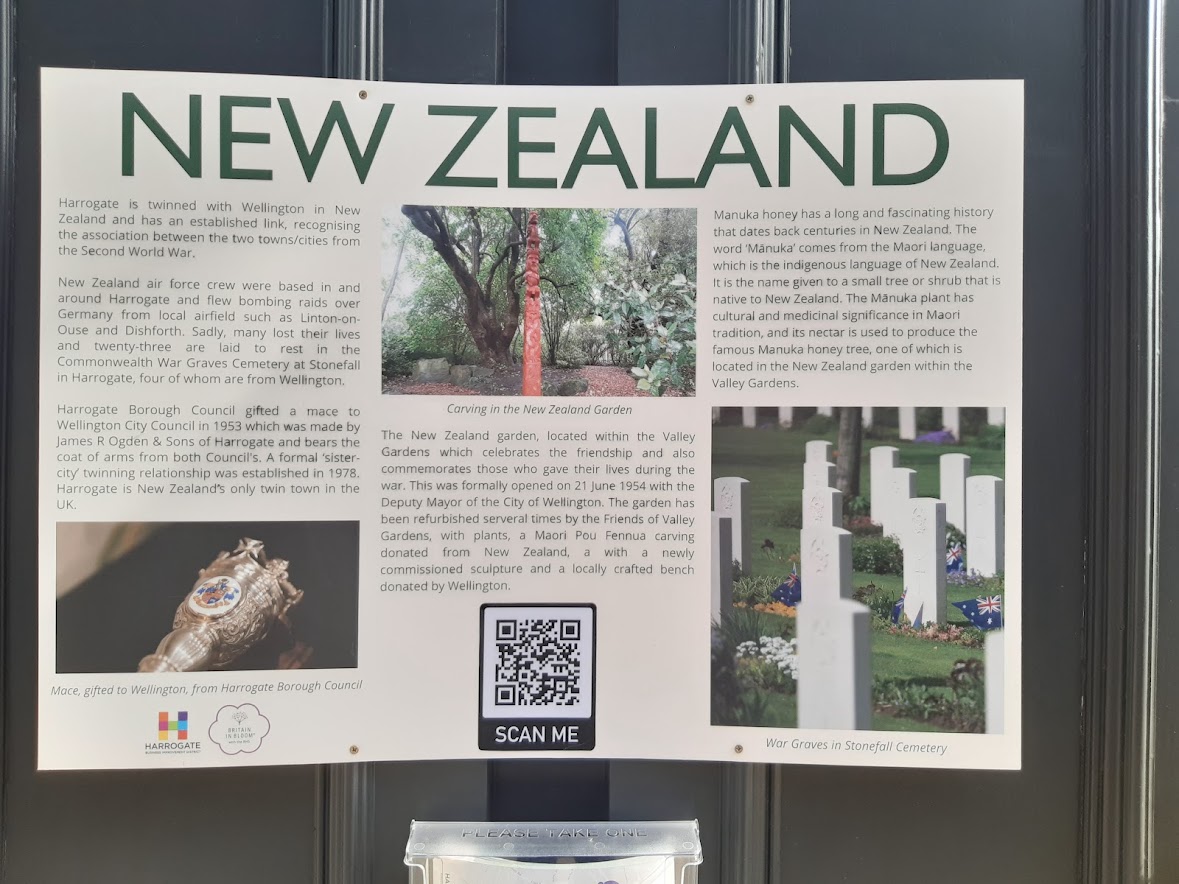 The trail started near the war memorial with a globe showing the twinned locations, alongside the eye-catching obelisk which shows more detail for each one. A floral trail connected the exhibits, with explanation boards at each site. For those related to the twinned locations, these included a short summary of the connections and how they came about.