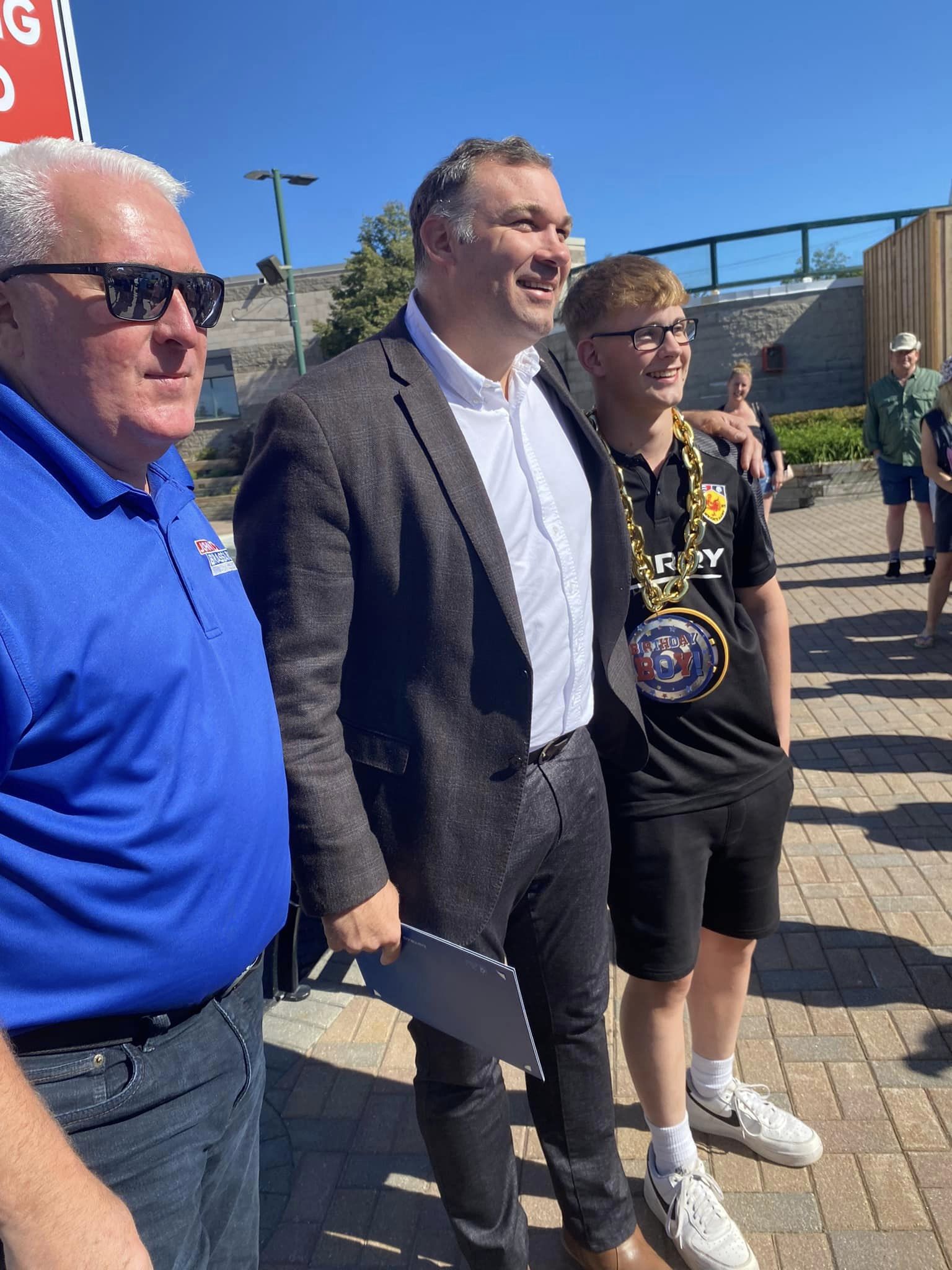 In Barrie itself, they visited the massive Spirit Catcher statue which overlooks the bay, went swimming in the lake at the foreshore beach, met Alex Nuttall the Mayor in the Council Chamber, and helped to mark Yorkshire Day on 1 August with the raising of the Yorkshire flag in Barrie.
