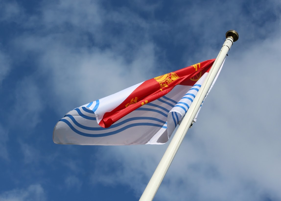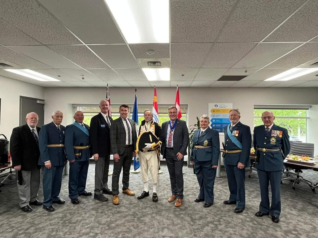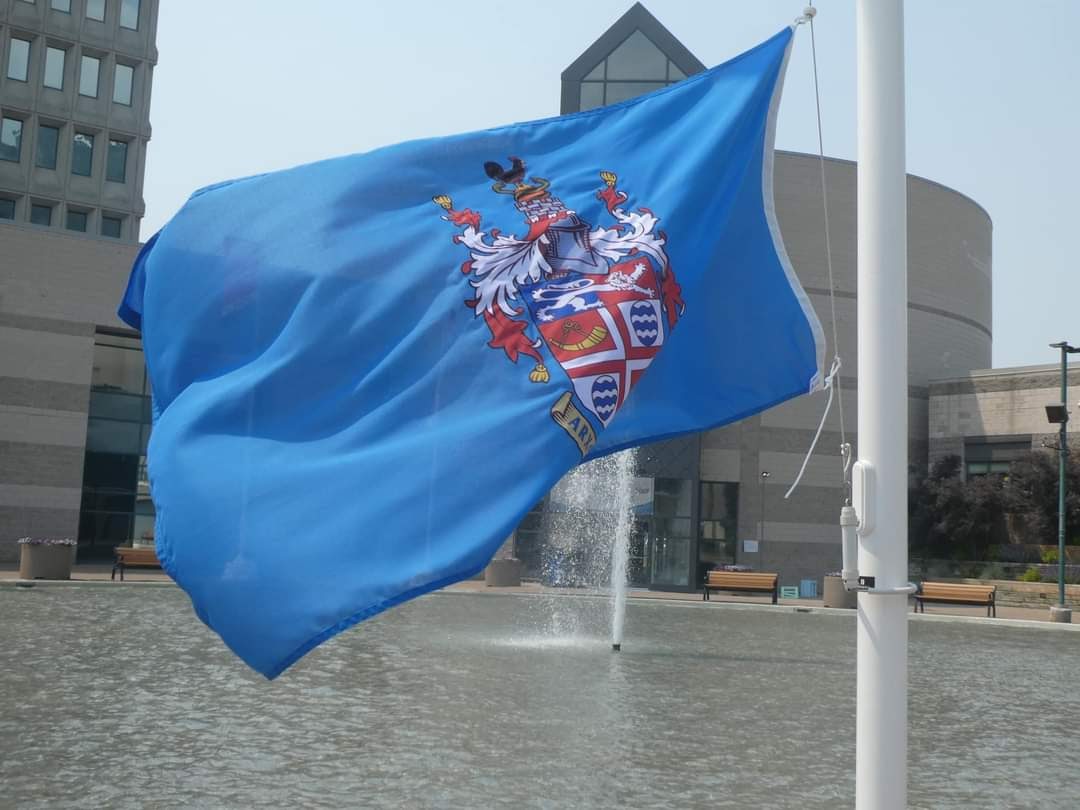 The flag from the City of Barrie in Ontario Canada was presented by Mayor Alex Nuttall to Harrogate’s Charter Mayor Michael Harrison in April 2023 during Mayor Nuttall’s visit to Harrogate.