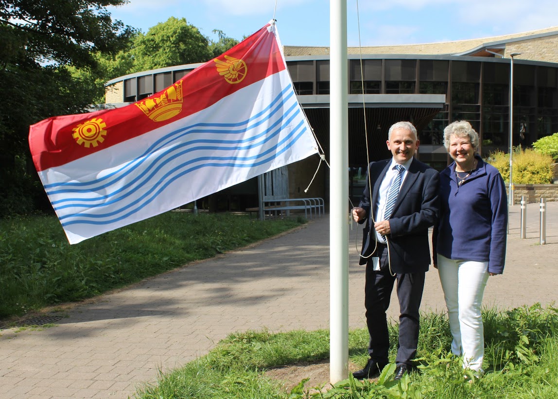 Charter Mayor Michael Harrison and HIP Trustee Mary Andronowski with the Barrie flag outside the Civic Centre offices in Harrogate.