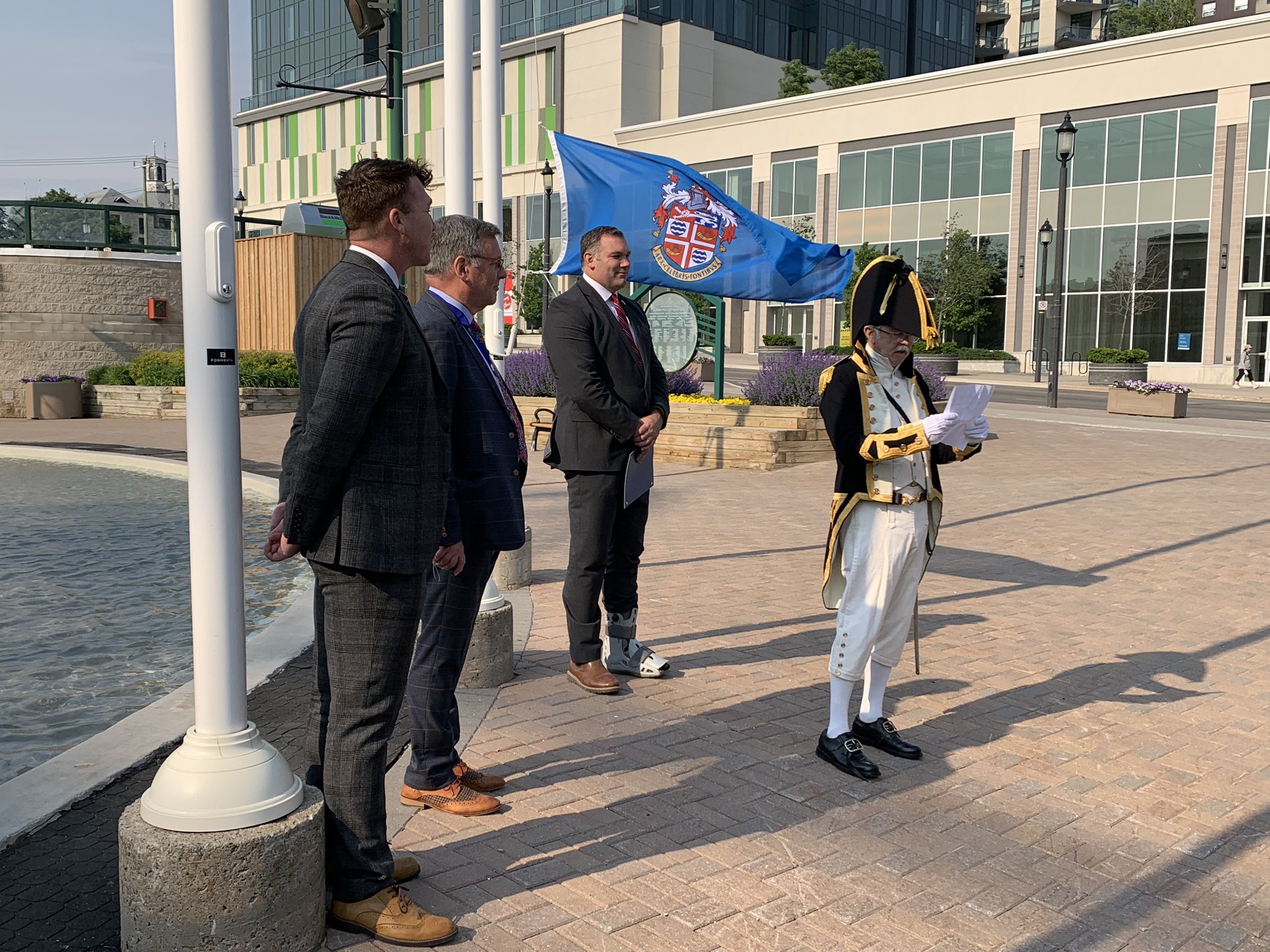 Barrie Mayor Alex Nuttall oversees the raising of Harrogate’s flag near the waterfront in Barrie to commemorate Sir Robert Barrie Day and the tenth anniversary of the signing of the twinning agreement.